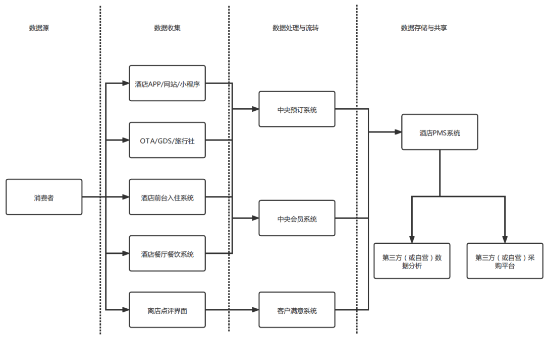 在入住场景中,消费者通常会通过3类系统入口入住酒店、接受服务,同时基于不同服务场景被收集相应的数据。3类系统分别是酒店APP/网站/小程序、OTA/GDS/旅行社以及酒店前台入住系统。
